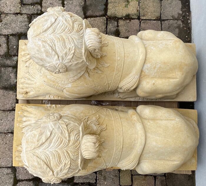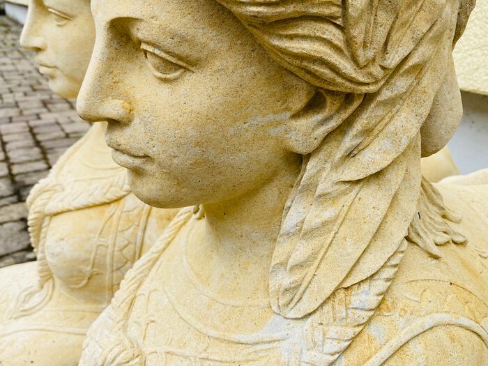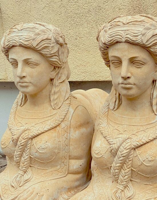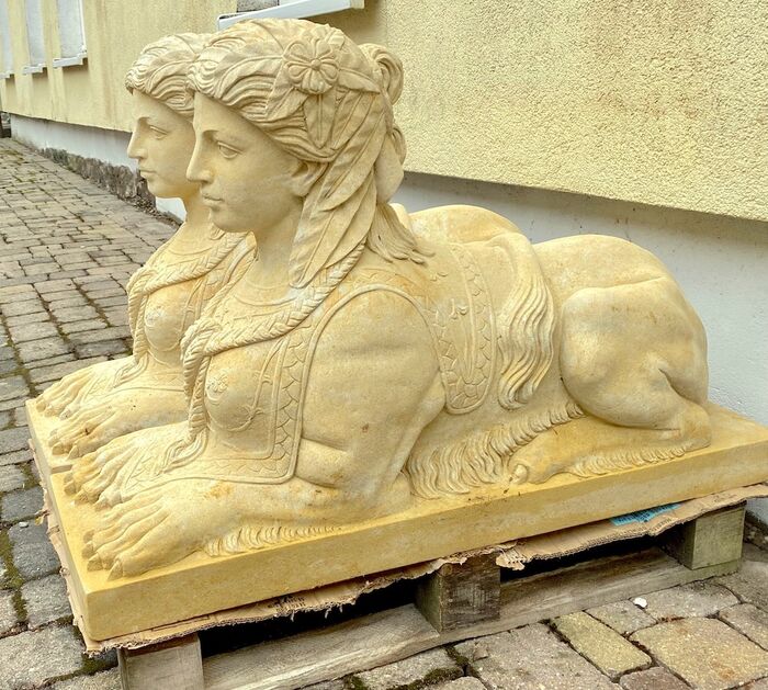 Paar dekoratiivseid liivakivist sfinkse, aiafiguure, klassikalisi väga kvaliteetseid figuure detailsete ornamentidega, valatud liivakivist.
